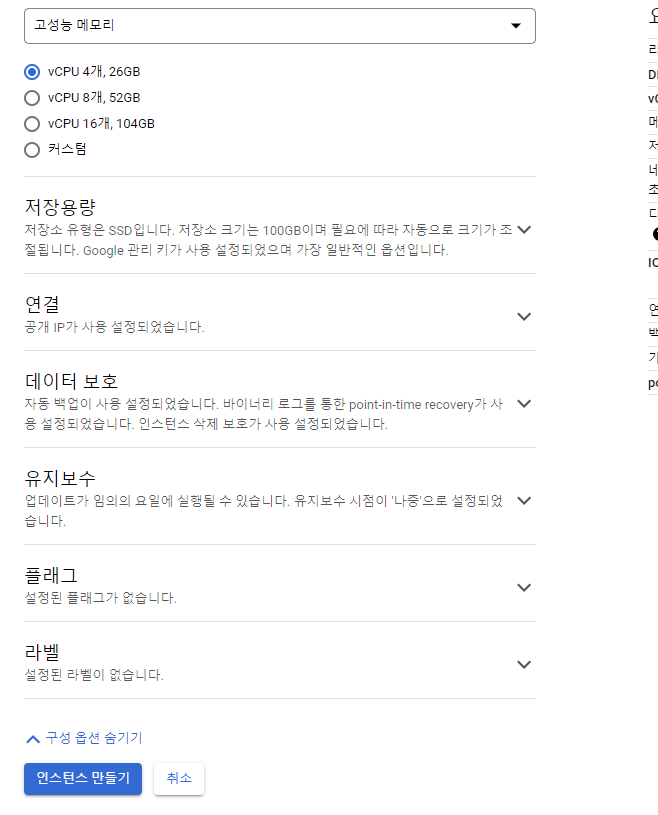 원하시면 구성 옵션 열어서 성능도 조정이 가능합니다 그 다음 [ 인스턴스 만들기 ] 를 눌러줍니다