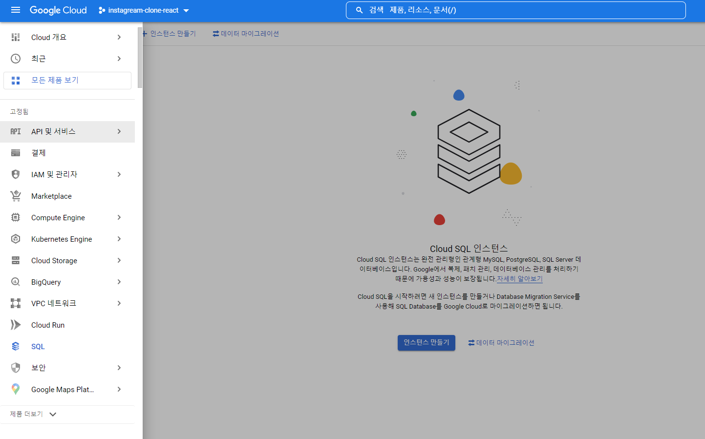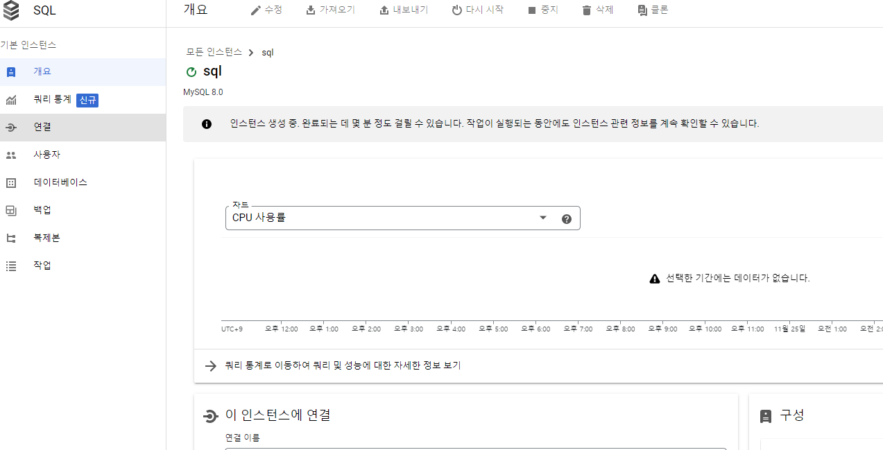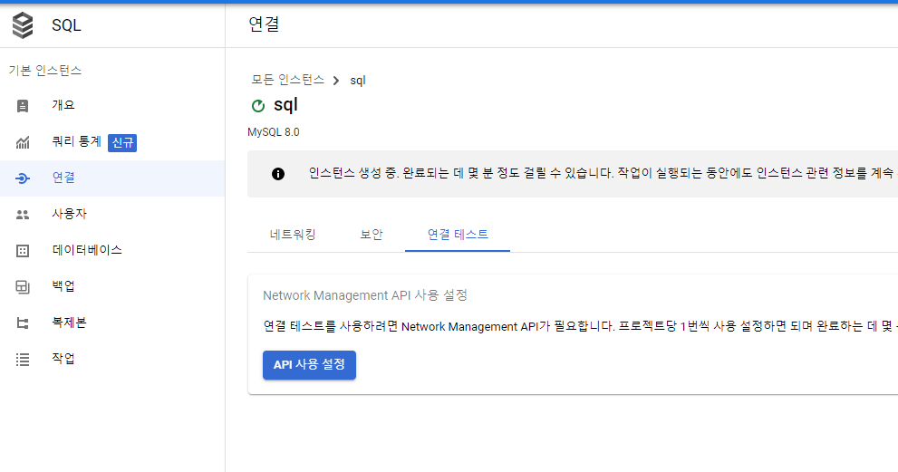그 다음에 sql 인스턴스 생성을 잠시 기다려줍니다 ( 생각보다 오래걸림 )