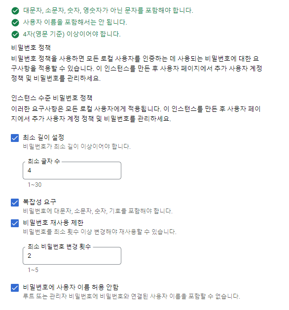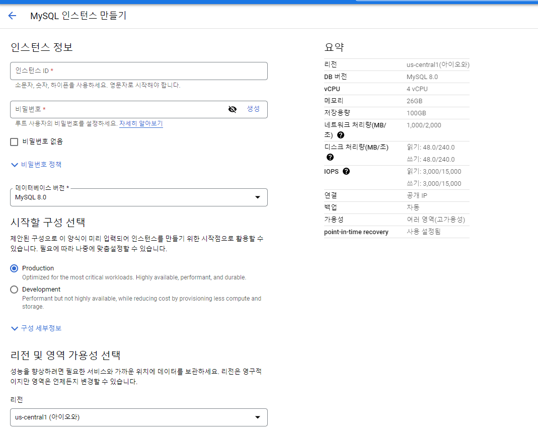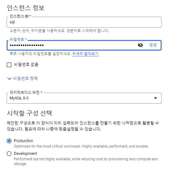 그러면 데이터베이스를 생성하는데 인스턴스 ID에는 소문자로 아무거나 적고 비밀번호는 생성 누르는게 제일 안전합니다