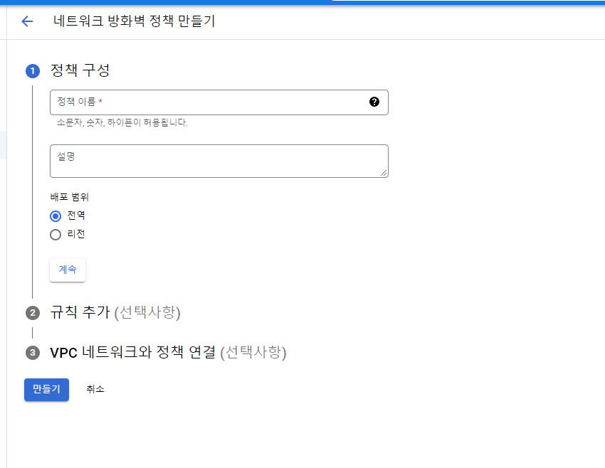 정책의 경우 규칙보다 조금 더 큰 개념으로 VPC 같은 가상 네트워크를 온프레미스( 독립 서버 ) 등과 연계해서 GCP 통합 관리에 사용되는 옵션 같은 건데 이걸로 해도 상관 없습니다