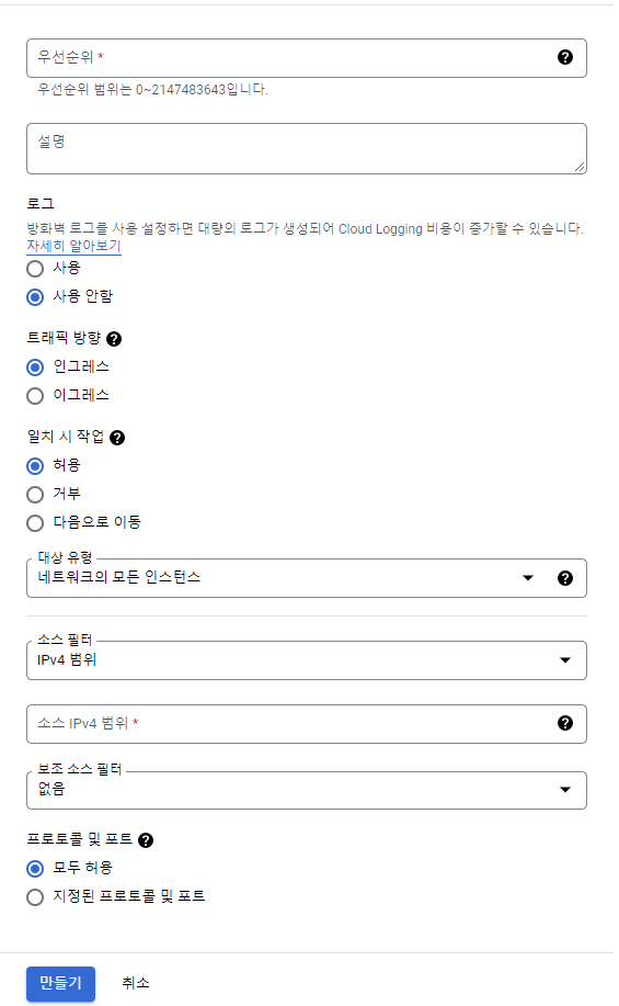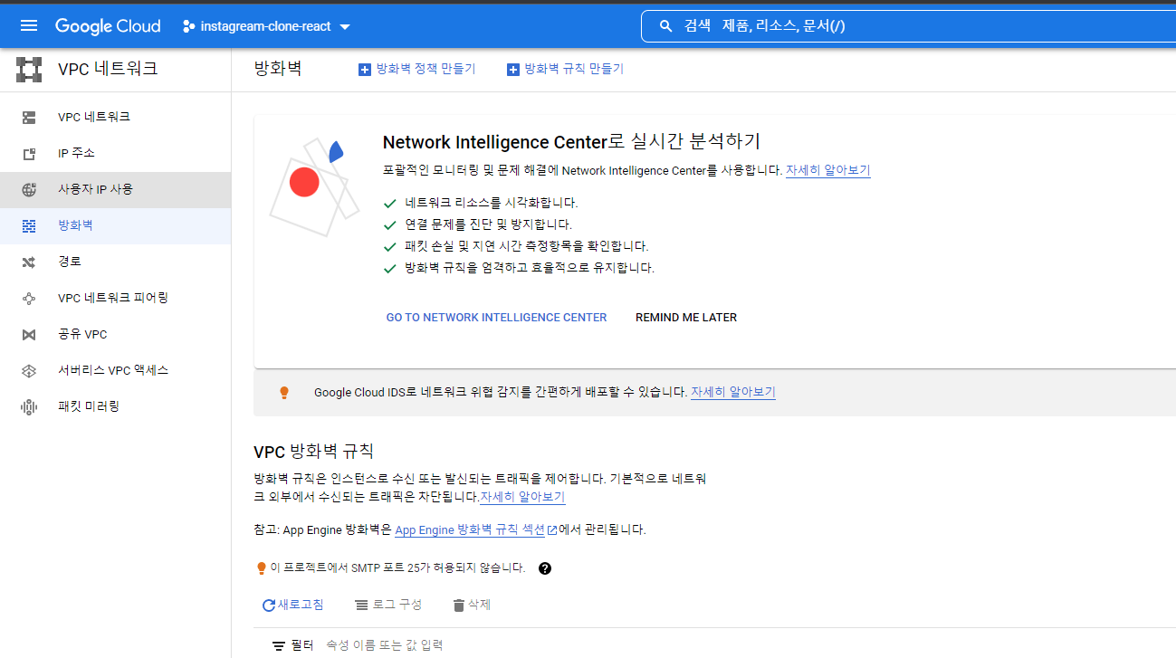 규칙은 인스턴스에 적용되는 개념이라고 보면 되는데 GCP 내부적으로만 사용 가능한거 라고 보시면 됩니다