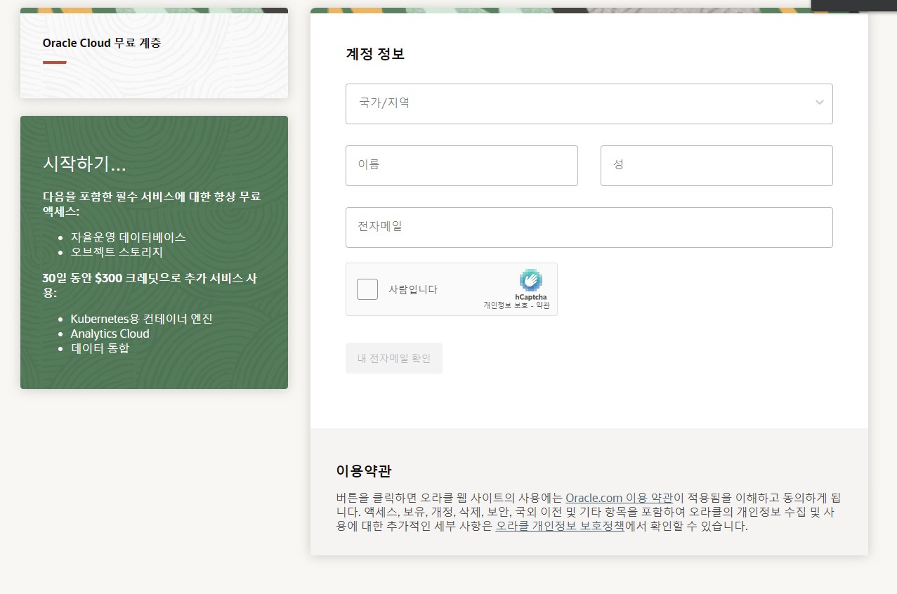 여튼 프리티어 가입 페이지에 와서 Oracle Cloud 무료 계층 뜨면 대-충 입력해 주고 내 전자메일 확인 누릅니다