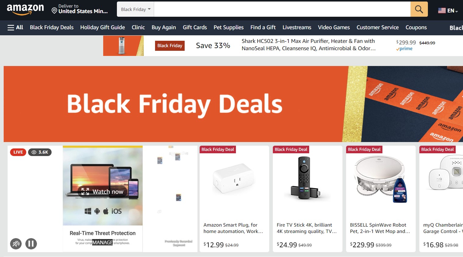 오늘은 블랙프라이데이 진행하고 있는 날인데 이런식으로 아마존에 접속하면 다양한 상품이 40~50% 할인한 상태입니다