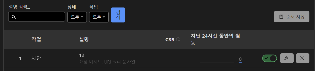 필드 항목에는 국가부터 IP주소까지 대량으로 선택 가능한데 요청 메소드( GET / POST ) -> 연산자는 같음 -> and 택해주세요