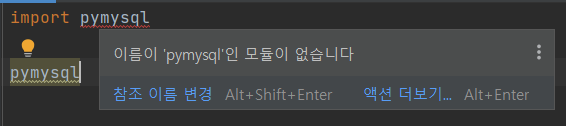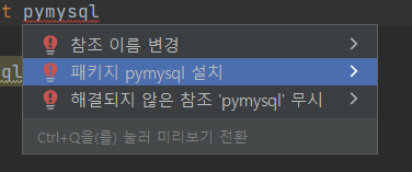그럼 무시할지 이름을 바꿀지, 설치할지 정할 수 있는데 패키지 pymysql 설치 하면 알아서 설치를 해줍니다