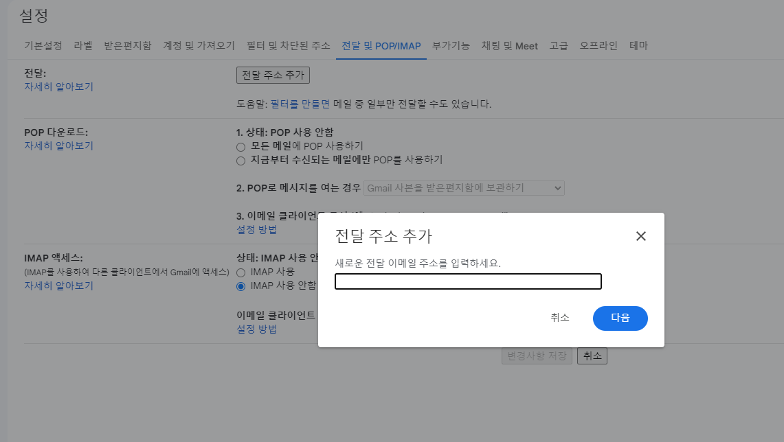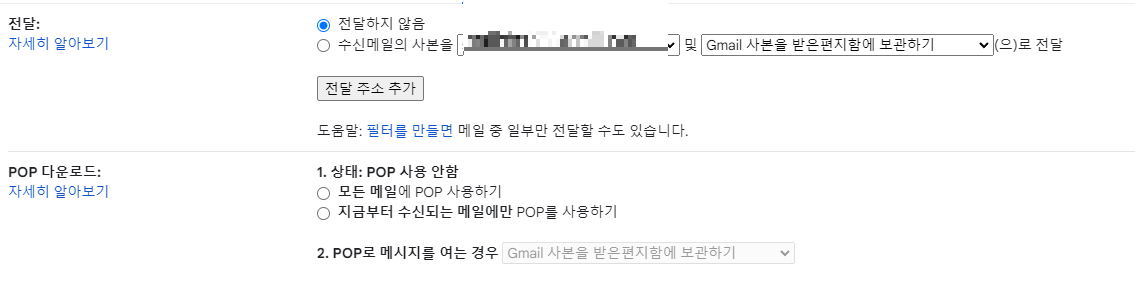 전달 및 POP / IMAP 로 이동합니다