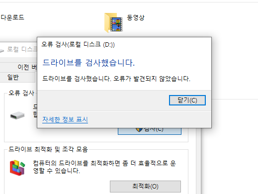 이미 검사 ( 자동으로 함 ) 에서는 오류가 없다는데 무시하고 [ 드라이브 검사 ] 를 누릅니다