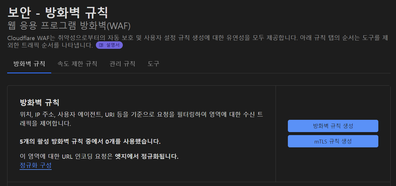 클라우드 플레어 -> 보안 -> WAF 로 이동해줍니다